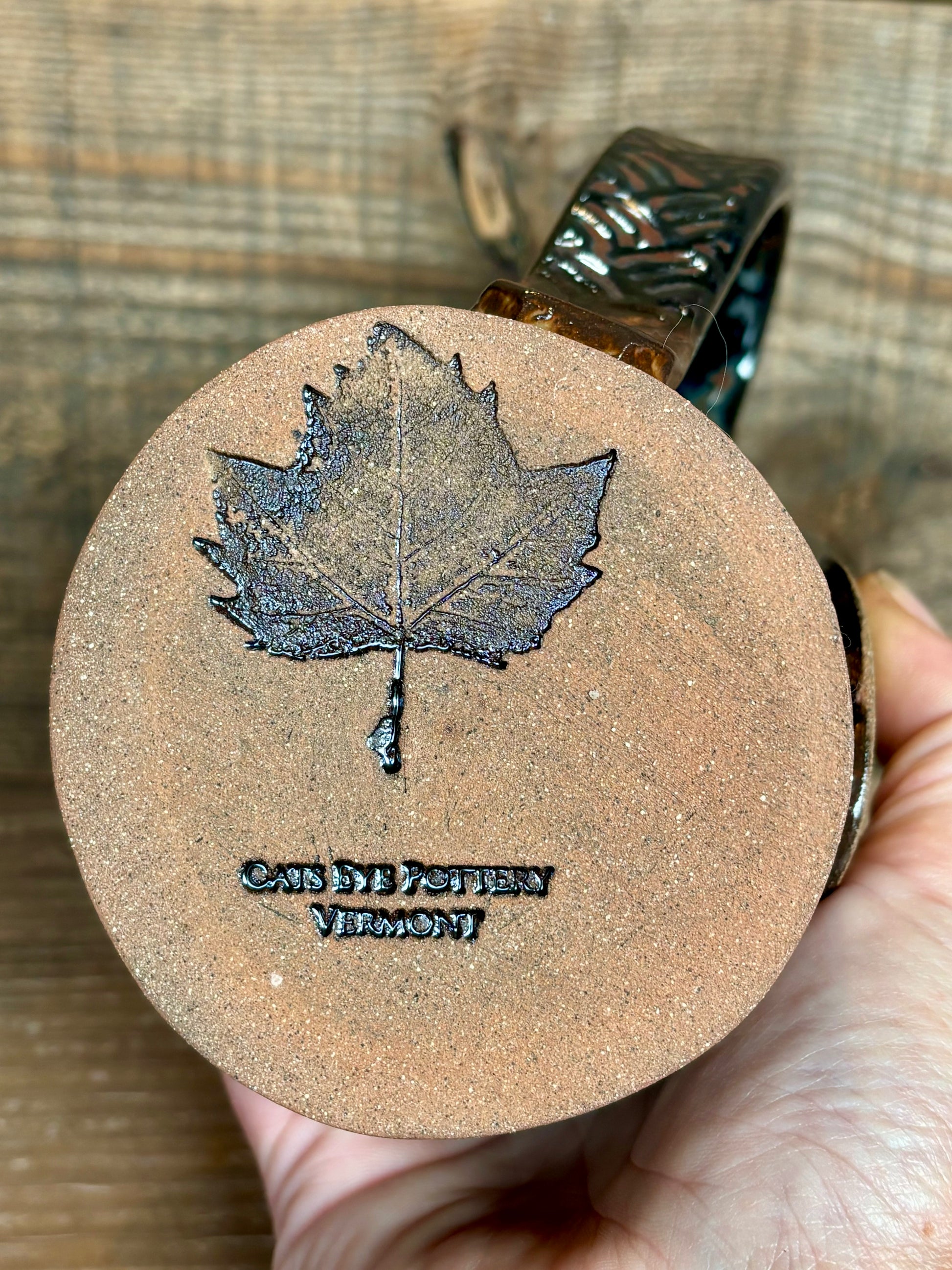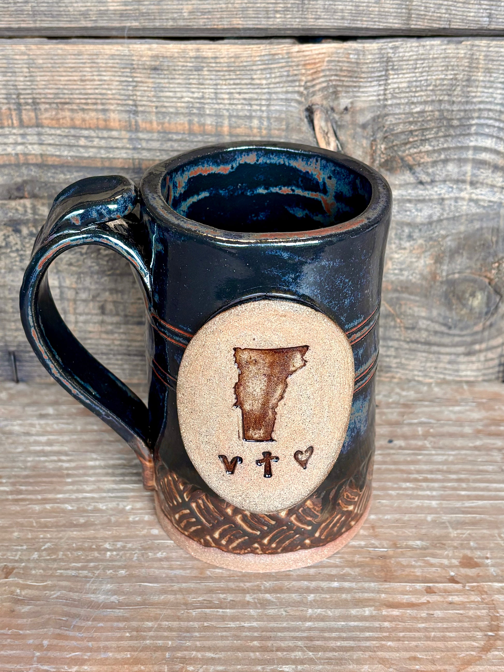 Rustic Vermont Love 14 oz mug with thumb rest, glazed in Smokey charcoal and brown glaze.