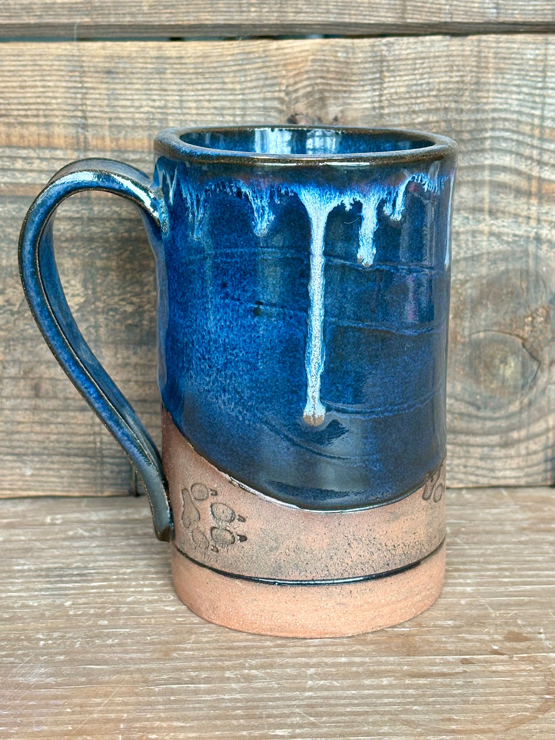 Rustic Wild River Wolf 14 oz mug, glazed in river blue and brown glaze.